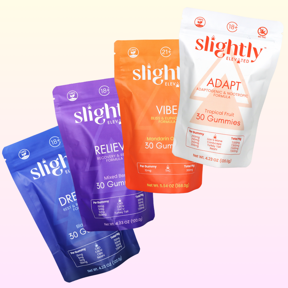 Elevate each day with these delicious Slightly Elevated Mushroom & Cannabinoid Blends Gummies! Each blend is crafted with premium botanicals and/or mushrooms to energize or soothe, depending on the mood. Each pack contains 30 gummies.