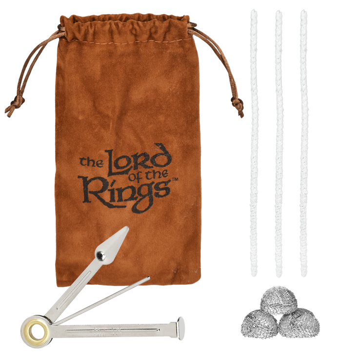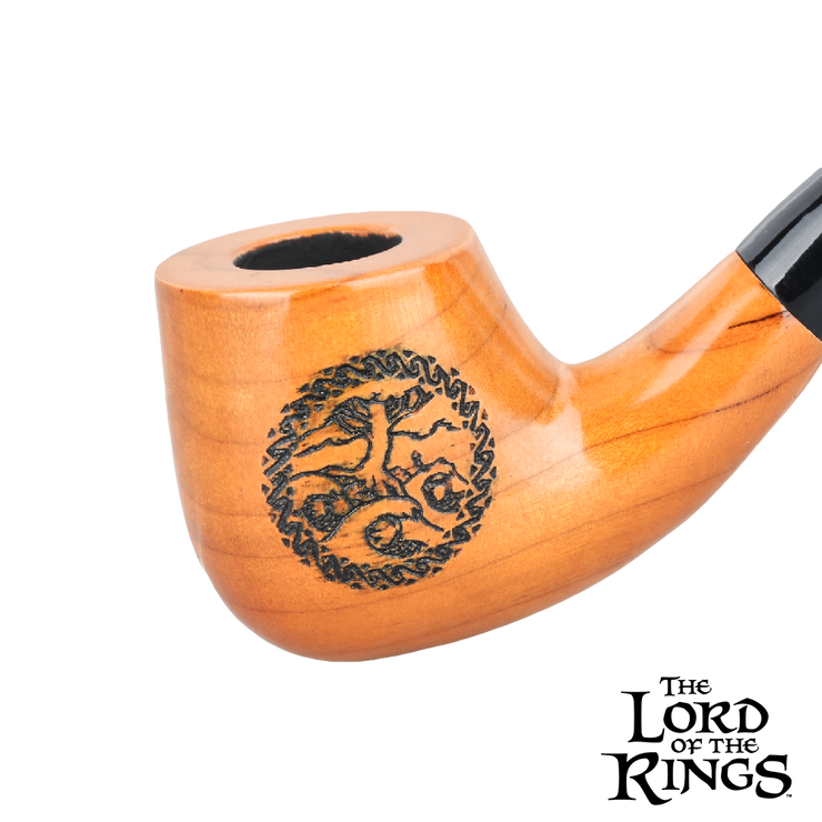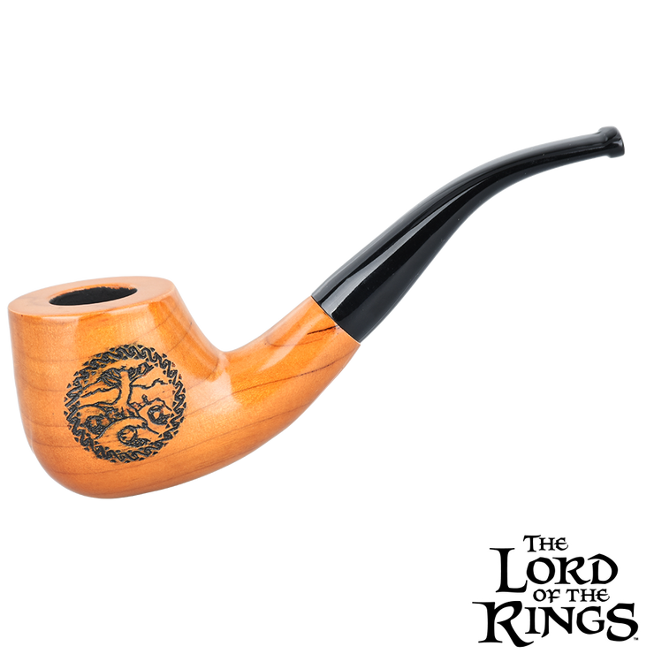 The Home Again Pipe is a mortise-and-tenon bent brandy-style pipe made of natural cherry wood with a tapered stem and a pinched mouthpiece. The side of the bowl is engraved with the Shire's landscape, a welcoming sight at the end of any journey. Collectible and functional, this pipe comes with a poking & tamping tool, bowl screens, & pipe cleaners.