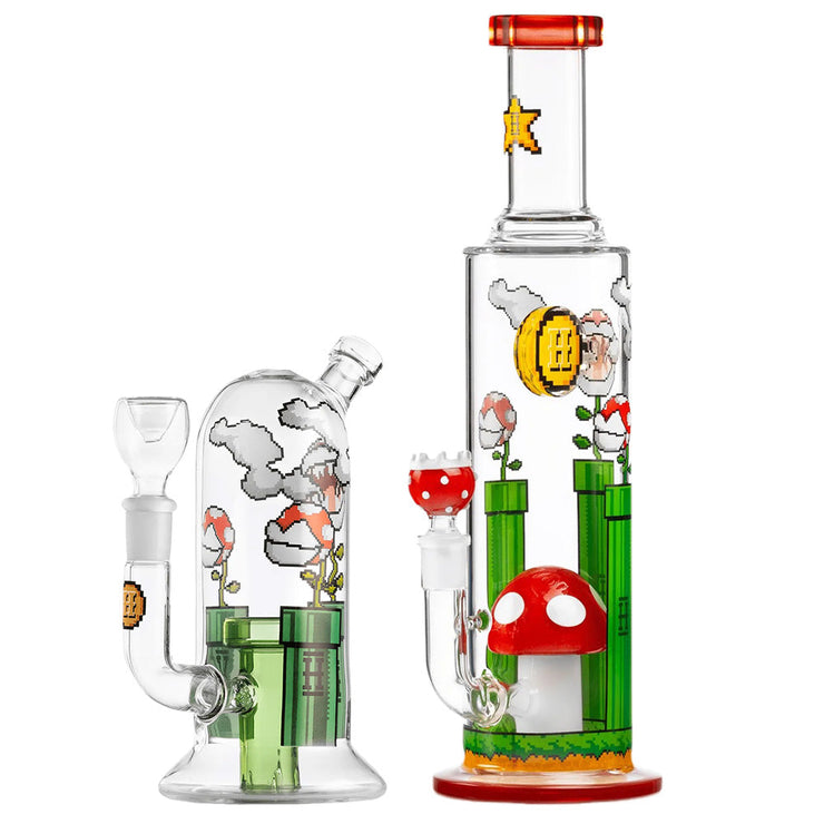 On an adventure to save your peachy princess from peril? Jump down a pipe and enter a whole new world of fun with the Gaming Flower Bong! Printed with a retro 32bit design of coins, clouds, and piranha flowers, you're sure to catch some gold star rips out of this bong. 1-Up your smoking with the Gaming Flower XL, which has a straight bodied chamber that contains a toadstool percolator and a coin decoration above. The XL is also decked out with red accents on the mouthpiece and base, complete with a piranha flower bowl. Each bong is made from borosilicate glass and includes a 14mm male herb slide.