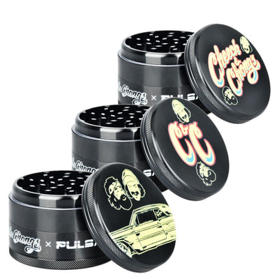 The Pulsar Metal Herb Grinder comes apart into four separate pieces, including a sifting screen that leads to a pollen chamber. Magnetic lid closure ensures the contents stay safely secured. The Psychedelic Alien design by artist Amberly Downs depicts a transcendental alien in a meditative state.