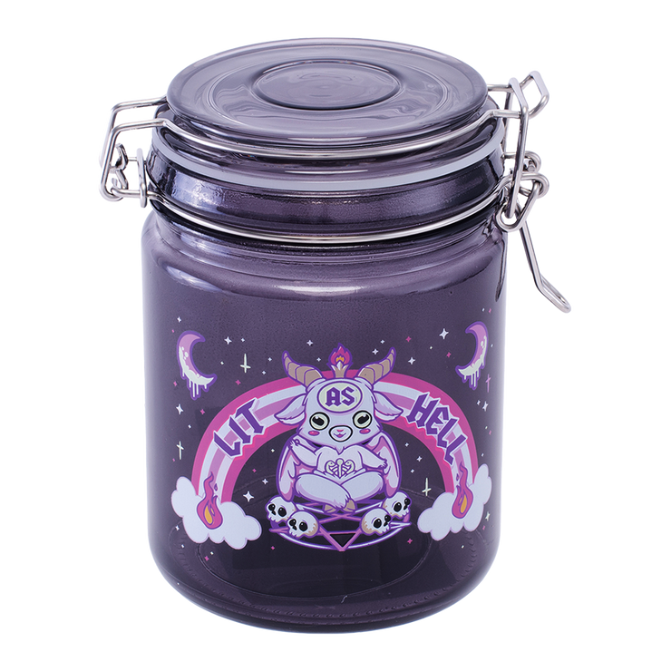 The Lit As Hell Airtight Glass Storage Jar is made from quality borosilicate glass with a transparent black finish, extra thick for durability. This jar is sealed with a silicone O-ring and held tight by a metal hinge. The outside is wrapped with a design depicting an adorable goat overlord residing over cartoon skulls and a pentagram. Each jar has plenty of room for dry herb, or whatever else you need to store!