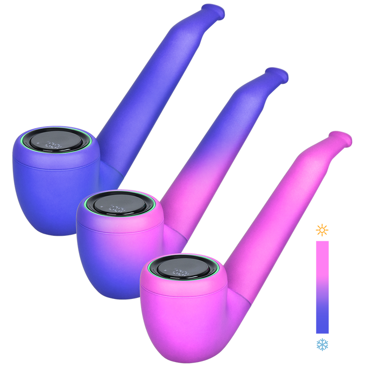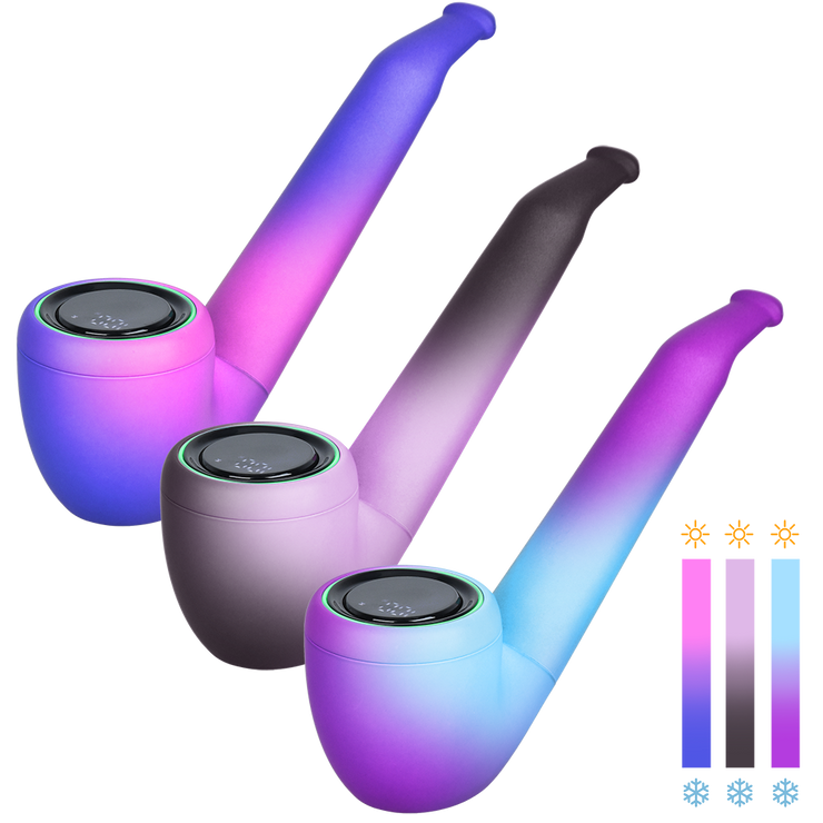 Sophisticated and stately, this vaporizer provides you the option of faux wood grain patterning all around the body that evokes feelings of hand-carved rich mahogany. If you're in search of a bit more vibrancy, a selection from our heat-reactive color-changing Thermochromic series will suit your fancy. This unit's battery is concealed in a rounded housing for the base, which connects to the 510 cartridge of your choosing. Simply attach the bent pipe stem mouthpiece and you're ready to enjoy!