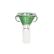 The Pulsar Bubble Matrix Herb Bowl is a sturdy borosilicate glass herb slide with an intricate bubble matrix design and exterior grip marbles. This conical bowl has a thick glass wall and features a male joint connection. Each slide has a 14mm male joint connection size.