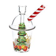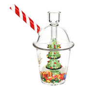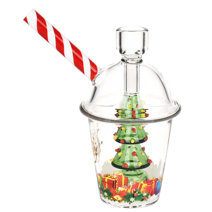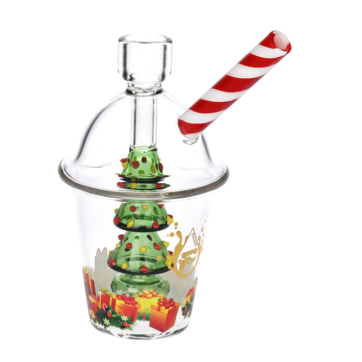 Sip and savor the holidays when you light up with the Pulsar Christmas Cup Bubbler! This pipe is made from quality borosilicate glass into the shape of a drink cup complete with a candy cane swirl straw mouthpiece. Smoke travels down into the chamber through the Christmas tree perforated percolator within, creating plenty of bubbles as you inhale. The outside is decorated with wrapped gifts and garland galore!