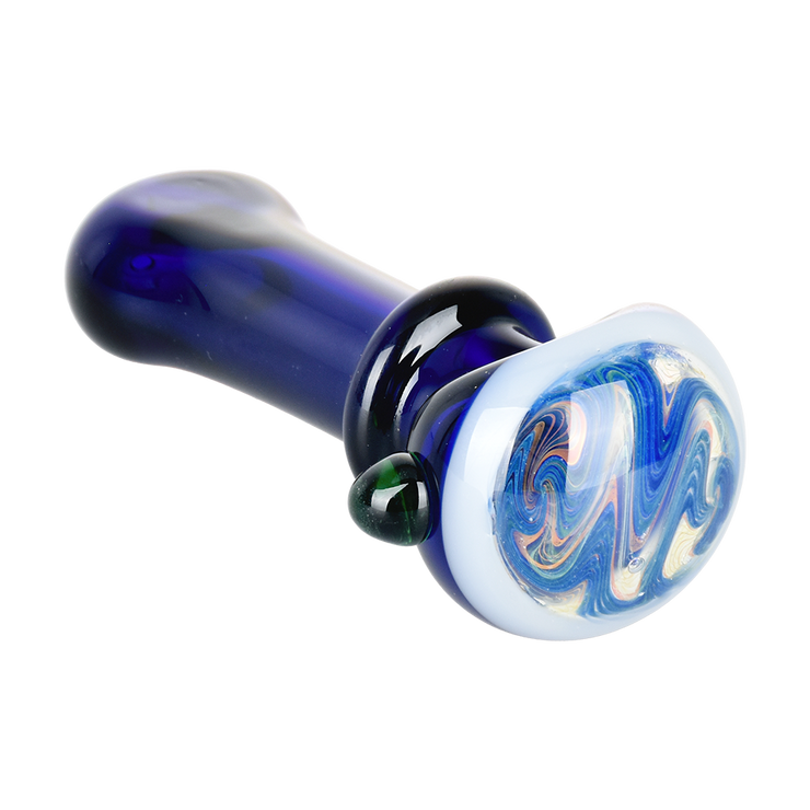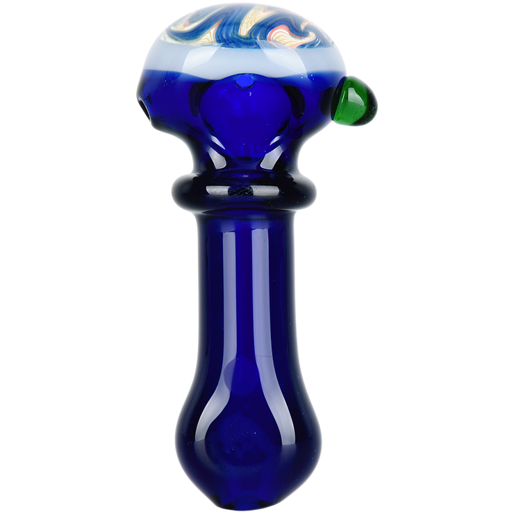 Gaze into the depths of mystery with the Future's Return Spoon Pipe! Made from dark blue borosilicate glass, this hand pipe has a fumed swirling design on the bowl's face that changes color with use. The simplistic spoon style body is accented only by a single ring in its midsection and a slightly pinched mouthpiece. A roll-stop marble is fixed to one side of the bowl while a carb hole is built into the other side.