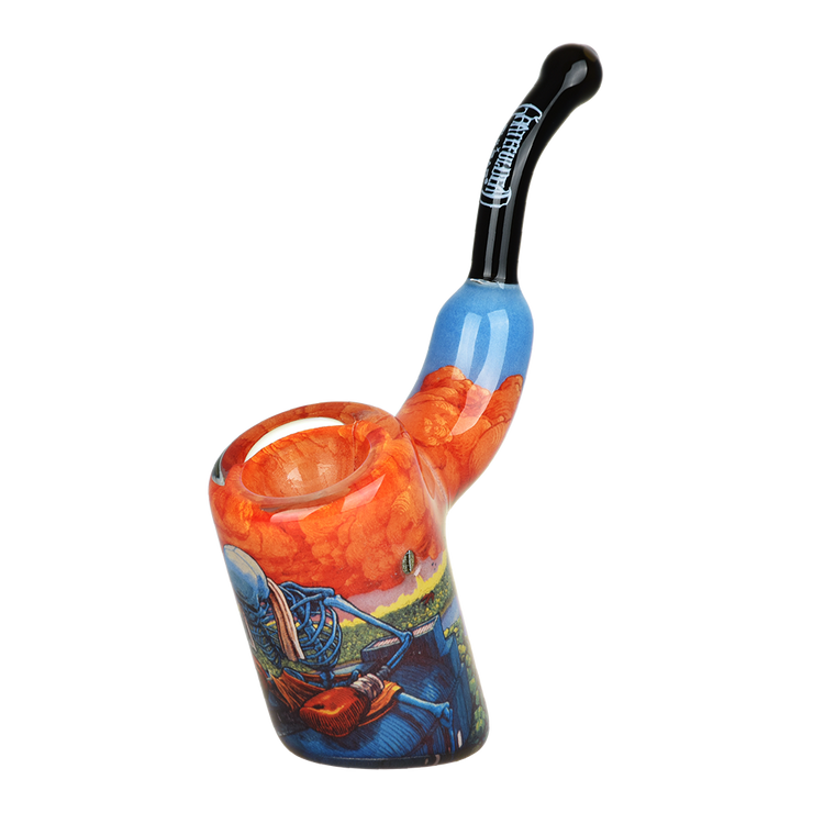 Sit back, light up, and blast off to some tasty jams with a pipe from the Grateful Dead x Pulsar collaboration! The Inside Print Sherlock Pipe is made from durable borosilicate glass with an eye-catching design encased within, preventing scratches or fading of the bright colors. The Boxer design is from Volume 35 of Dave's Picks, a series of limited release triple-disc live albums from the group. It pictures a detailed sketch of a giant skeleton in boxing garb, waiting to enter the arena below. An angry storm brews above, while flocks of birds and a meandering river drift by.