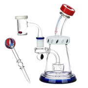 This rig set has nothing but the best in store for all the Deadhead dabbers out there; that's why we've included a custom fully-welded seamless banger etched with the band's logo on the front. This type of joint is more durable than a standard weld and stands the test of time just like the music. A sandblasted spinner disc carb cap rests on top creating a vortex airflow to whirl the two terp pearls around the banger's bucket, ensuring even melting and vaporization. The glass dab tool is decorated with a Stealie marble and the luxury gift box brings this setup all together.