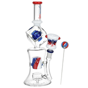 Jam out at your next sesh with the Tesseract Hypercube Bong Set, a fresh release from the Grateful Dead x Pulsar collaboration! Made of premium clear borosilicate glass, this awesome water pipe is built for the ultimate enjoyment. Smoke travels through the curved exterior downstem and into the disc percolator, outfitted with laser-cut lightning bolt perc slots for a blast of water filtration. A barrel diffuser condenses smoke and helps prevent splashback into the additional swiss ball diffuser at the top for super smooth rips. Red, white, and blue accents adorn the diffuser and the custom wig wag herb slide. Each bong includes a metal poker tool decked out with a glass Stealie marble.