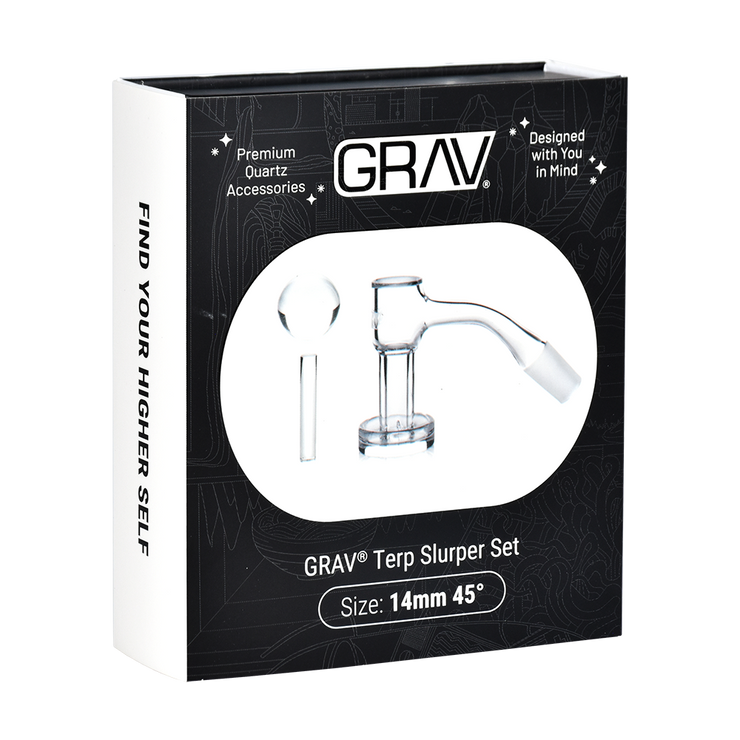 Enhance your dabbing experience with the GRAV Slurper Bucket Banger Set! Constructed from premium quartz material, this banger has a beveled top edge compatible with the marble style carb cap. The banger's thick bottom dish ensures lasting heat retention and the fully welded, seamless joint promotes longevity no matter how often you dab. The slurper style bucket has laser-cut directional slits for air intake, creating a vortex that spins the pillar insert to stir melted concentrate and promote even vaporization. Each banger has a 14mm male joint connection size and a 90 degree joint angle.