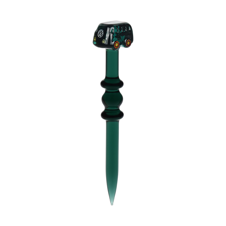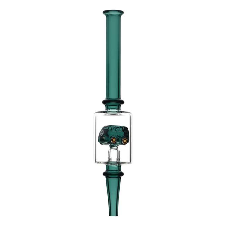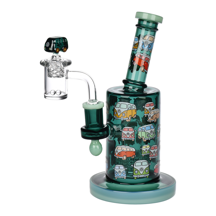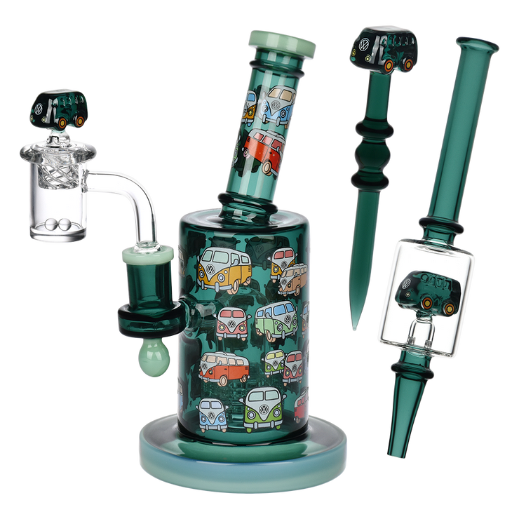 Made from quality teal borosilicate glass, the dab rig has a straight can style body with an extra thick base and an angled neck for comfort. Use the matching dab tool to scoop out your concentrate into the heated banger; vapors flow through the stemless joint connection into the matrix percolator within for fast and efficient water cooling. Outfitted with a flat top quartz banger, a matching van vortex carb cap, and two terp pearls, this dab rig set guarantees satisfactory vapors! Enjoy the ride with friends when you pass around the glass dab straw with a mini van centerpiece for a more portable way to enjoy concentrates.