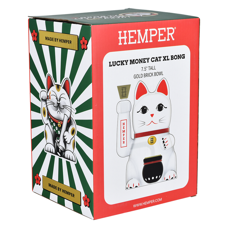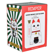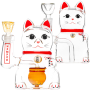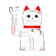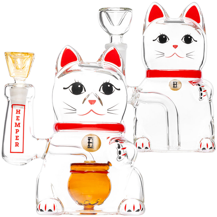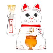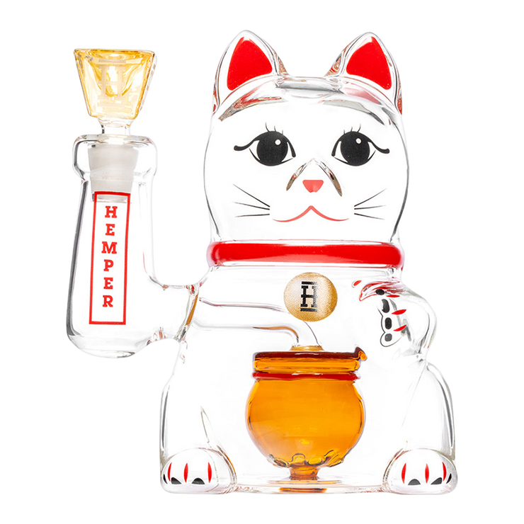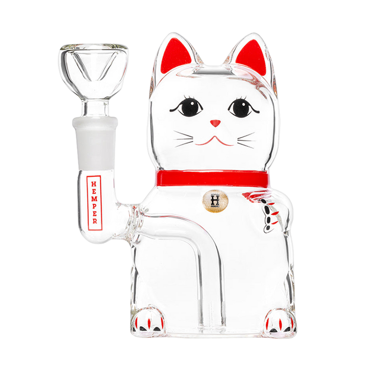 Revel in a world of prosperity with the Lucky Money Cat Bong from Hemper! Shaped like a beckoning cat figurine complete with adorable details like a scarf, a bell, and the charismatic soft smile, this water pipe ensures good fortune in the many smoke sessions to come! The cat's raised arm serves as the fixed stemless joint connection, and the perforated downstem offers quick bubbly water filtration. Each Hemper bong comes in a decorative gift box.