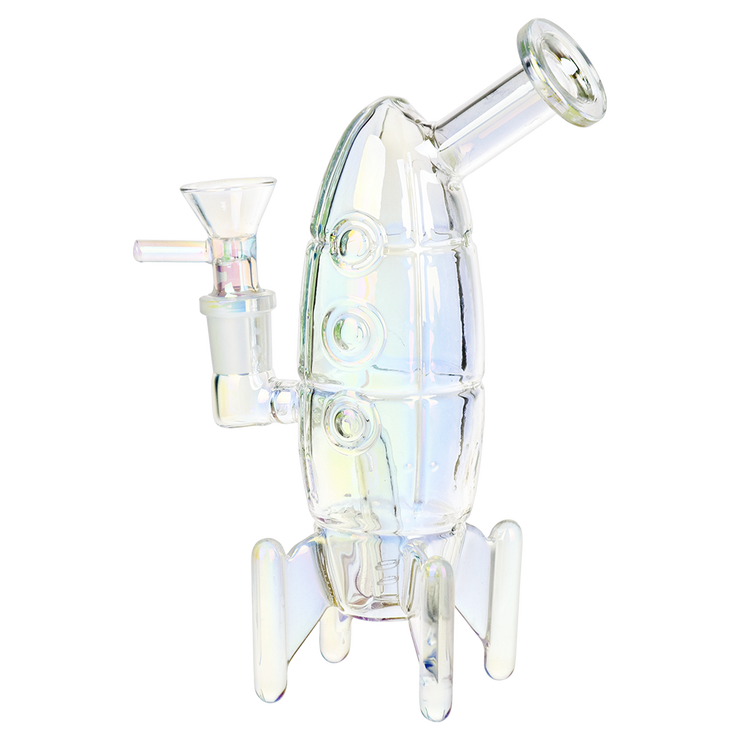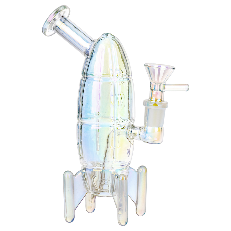 Elevate your daily sesh above the ordinary with the Journey To The Stars Electroplated Rocket Bong! Made from borosilicate glass, this water pipe has a flashy electroplated finish. It is designed to resemble an upright rocket that's ready for launch, all it needs is some firepower! Smoke travels down the fixed interior slitted downstem for a rumble of water diffusion while the angled neck keeps the flame away from your face. Each bong includes a 14mm male herb slide.