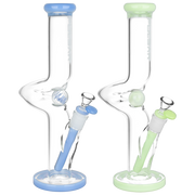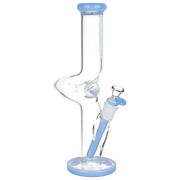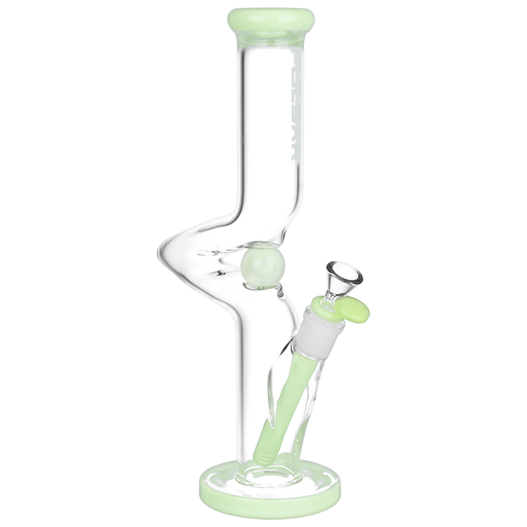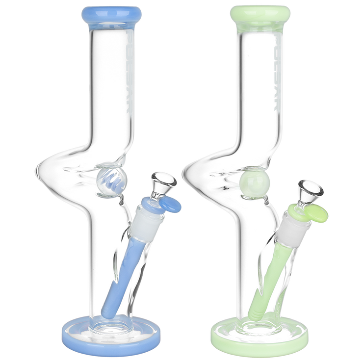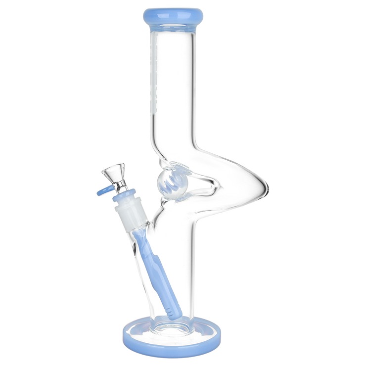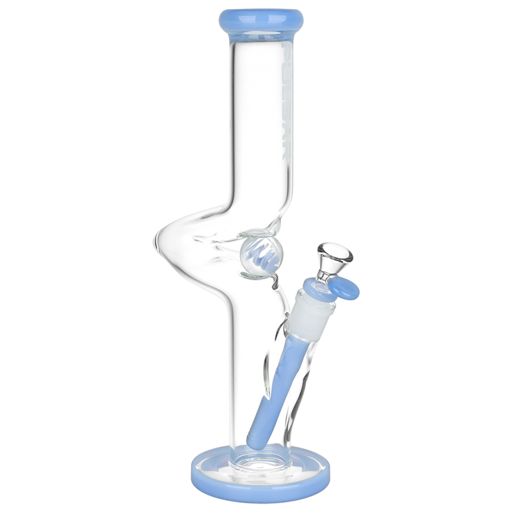 Put a spin on your next smoke sesh with the Pulsar Kinked Marble Tube Bong! A step above the ordinary, this pipe's single zig zag neck distinguishes it from an otherwise traditional straight tube style body. This design helps prevent splashback from the chamber and allows more time for hits to cool before inhalation. Smoke travels through the slitted downstem diffuser for ample bubbly water filtration that makes a smooth finish. This pipe is blown from quality borosilicate glass with colorful accents and a spiral marble that manually spins, great for fidgeting stoners when zoned out! Each bong includes a separate downstem and a 14mm male herb slide.
