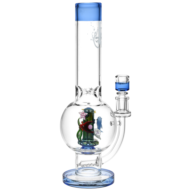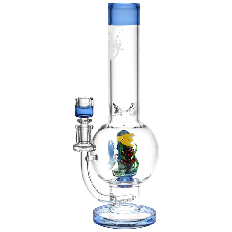 Cherish your own miniature sea habitat - minus the upkeep of an actual fish tank! The Pulsar Ocean Aquarium Bubble Bong is crafted from quality borosilicate glass with a high capacity bubble body for tons of smoky satisfaction. Smoke flows through the stemless joint connection into the mini inline percolator, then rises up into the UFO percolator for a double-filtered result. Big rips go down smoother when cold, so we've added a 3 pinch ice catcher to the wide neck so you can pack in all the ice you want! Swimming all around the perc is an intricate assortment of fishes, kelps, and corals, all flowing with the ocean's currents and accentuated by blue glass details. Each bong includes a 14mm male deluxe barrel style herb slide with a built-in screen to prevent ashes from pulling through.
