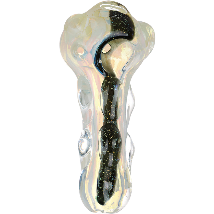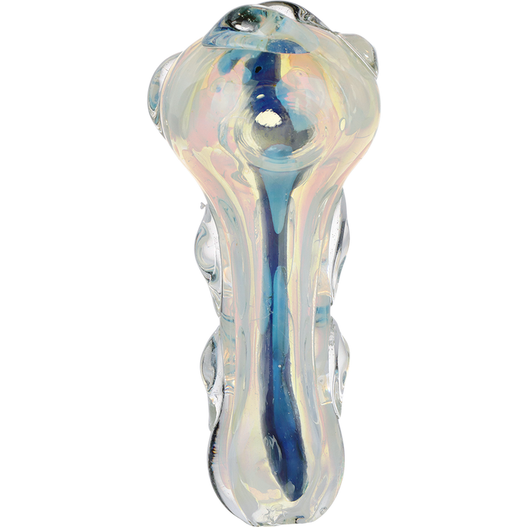 Enjoy a quick thrill anytime with the River Ride Dichro Stripe Spoon Pipe! This compact hand pipe is made from borosilicate glass with a fumed finish that changes color over time with use. The classic spoon style body has thick glass beading that adds to the weight and durability, while also accentuating its unique design. A single dichro-flecked stripe runs down the middle of the body while a built-in carb hole is on the left side.