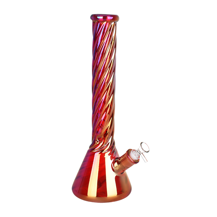 Bedazzle your next smoke sesh with the Ruby Luster Beaker Bong! This water pipe is made from quality borosilicate glass with a vivid electroplated finish. A rippling swirled texture runs along the neck, catching the light at different angles to radiant shades from bright pink to rosy red. Beaker style chambers have a high capacity for smoke and water, ideal for big rips that go down smooth! A slitted downstem diffuser is provides optimal filtration while a 3 pinch ice catcher is built into the neck for a refreshing finish. Each bong includes a separate downstem and a 14mm male herb slide. Two sizes are available.