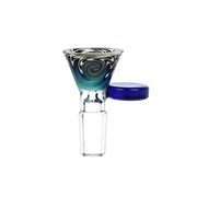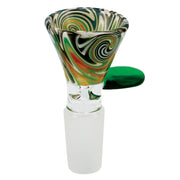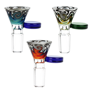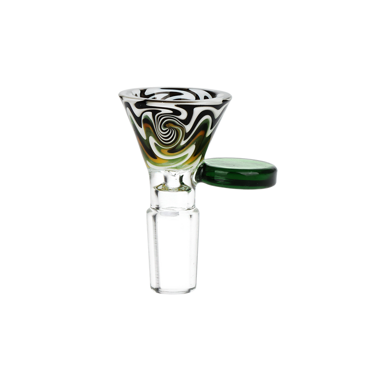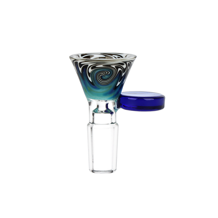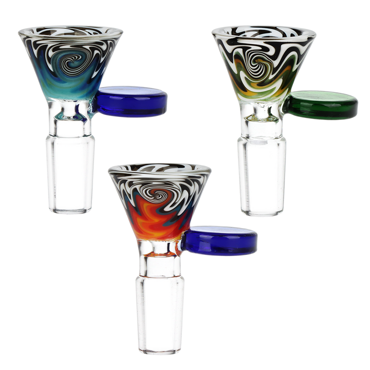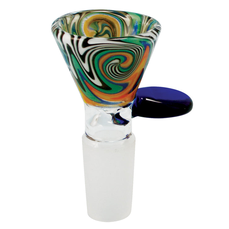 This bong bowl features colorful worked glass with a funnel-style bowl that you can pack plenty of herb into. On the side is a pull handle that is easy to grab. Each slide has a 14mm male joint connection.